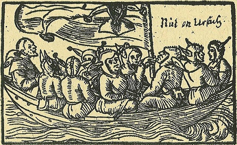 Arte*: Sebastian Brand (Estrasburgo, 1458-1521) fue un humanista y escritor de obras satíricas. En 1494, crea un nuevo género literario, el género bufo, al publicar su obra maestra Das Narrenschiff (“La nave de los necios”), crítica de la debilidad y locura de sus contemporáneos. Cuenta el viaje de un barco hacia la tierra de los locos y las aventuras de sus pasajeros. Inspirados en su libro surgieron infinidad trabajos artísticos como el presente grabado.
